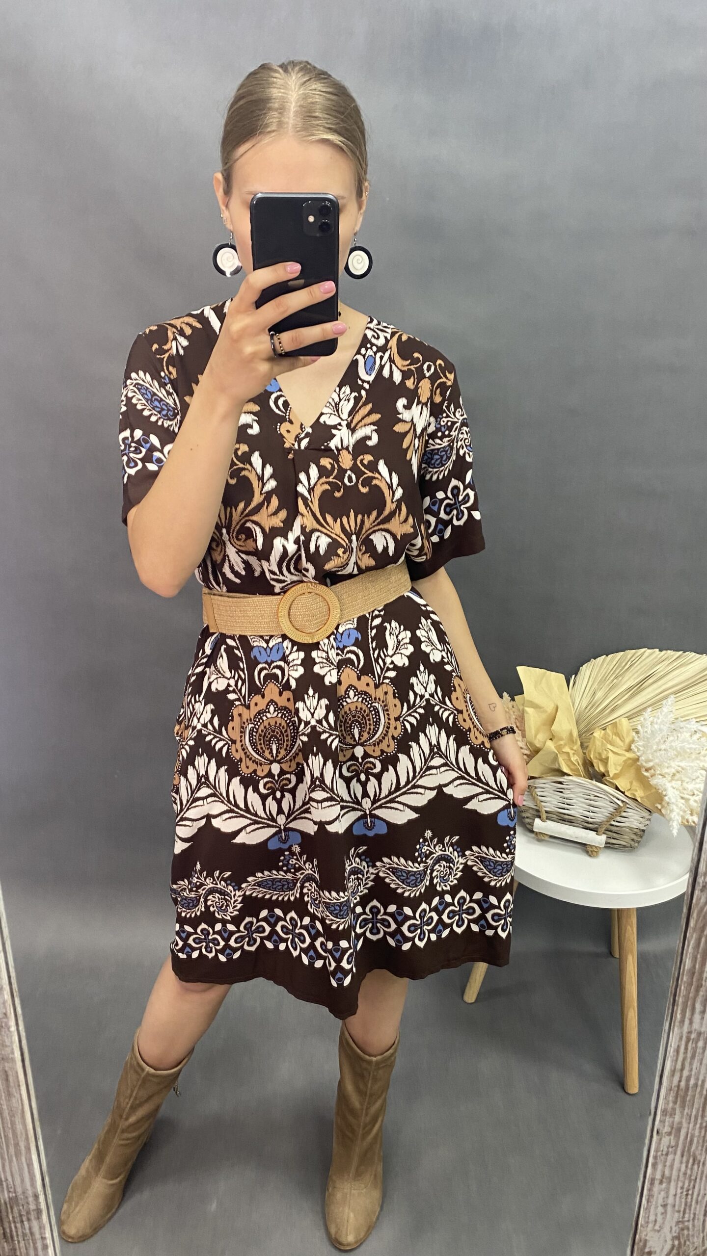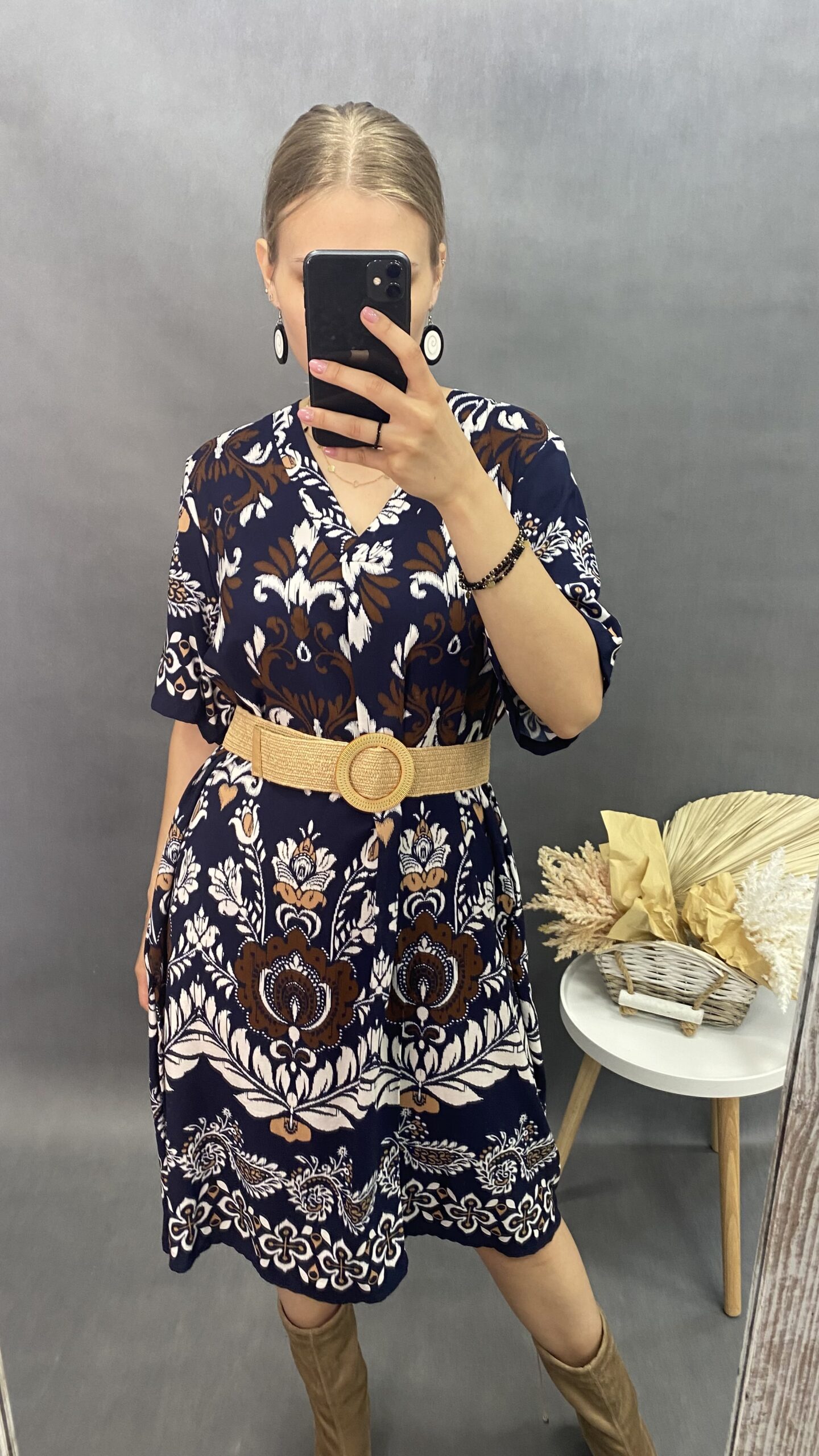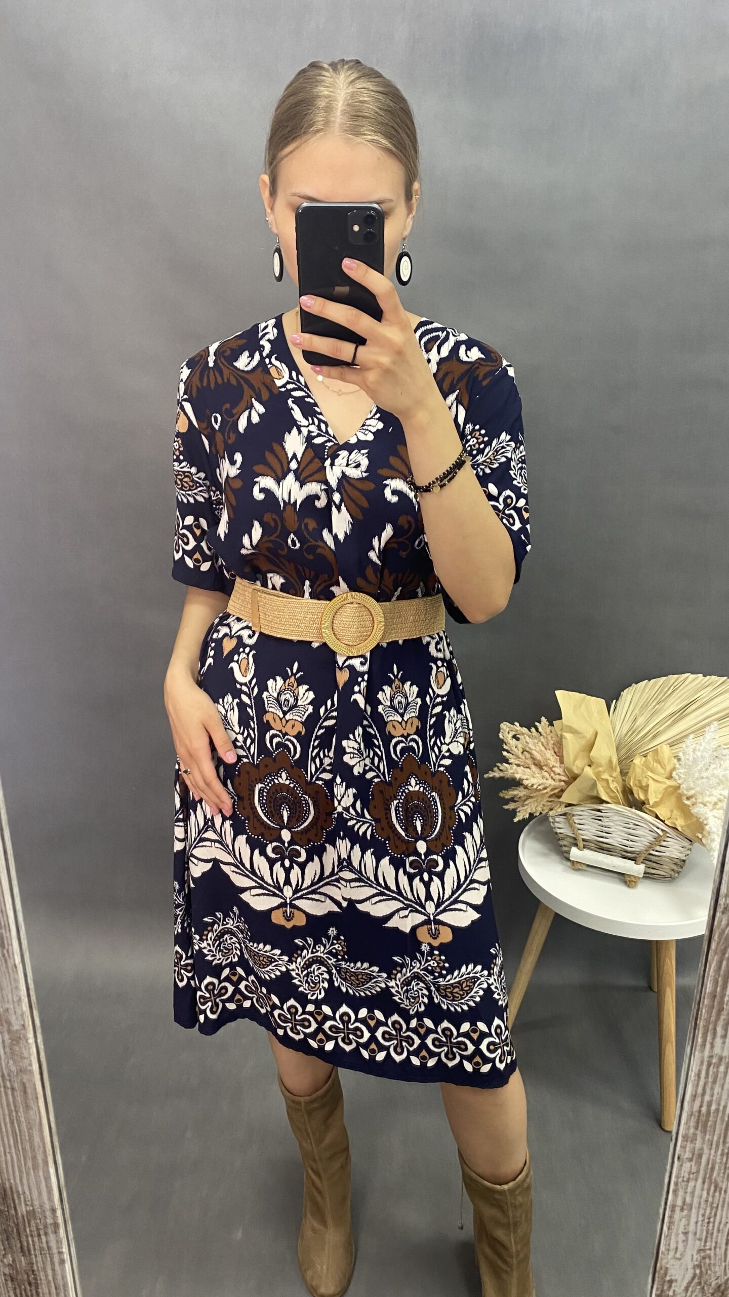 Sukienka midi w ciekawy wzór z krótkim rękawem. Dekolt w serek. Idealna na lato. Włoska produkcja. Jeden rozmiar, pasuje na M-XL.