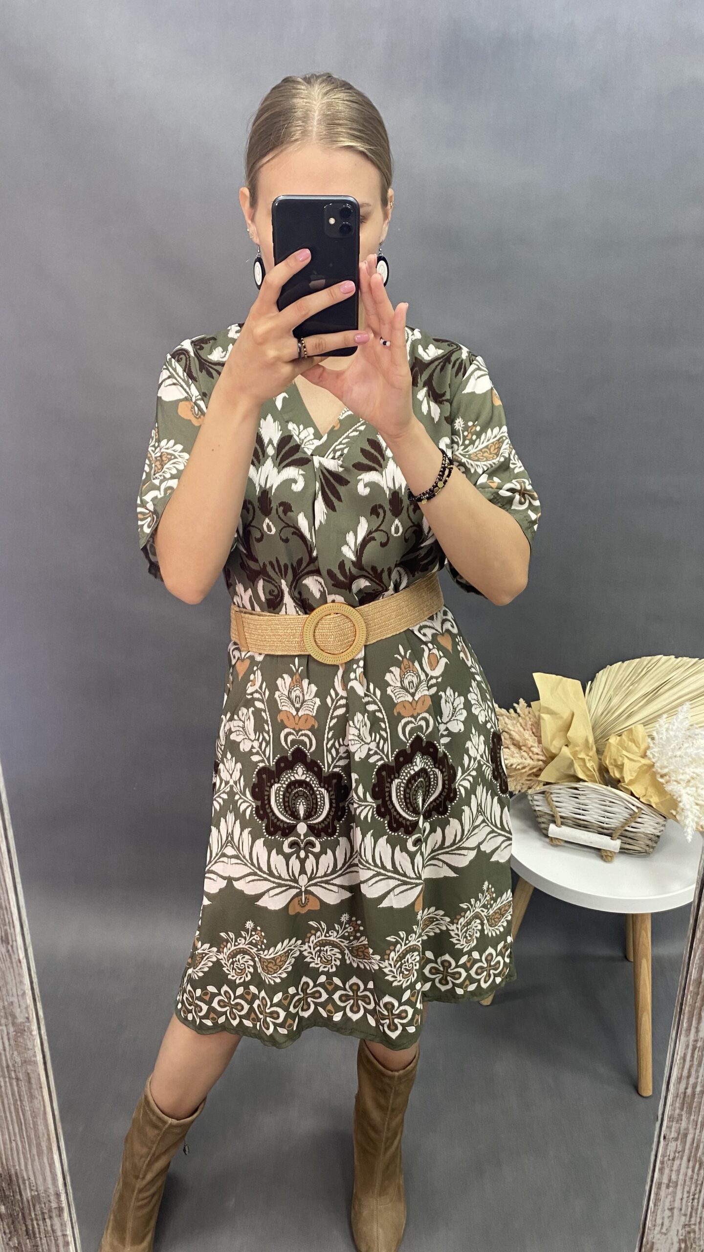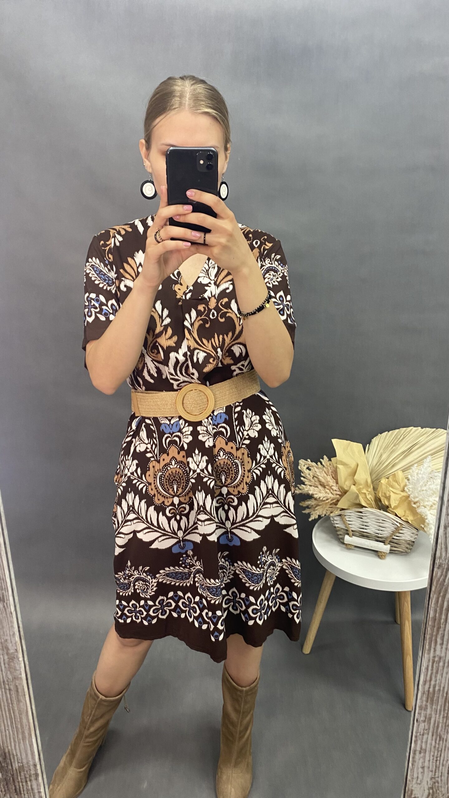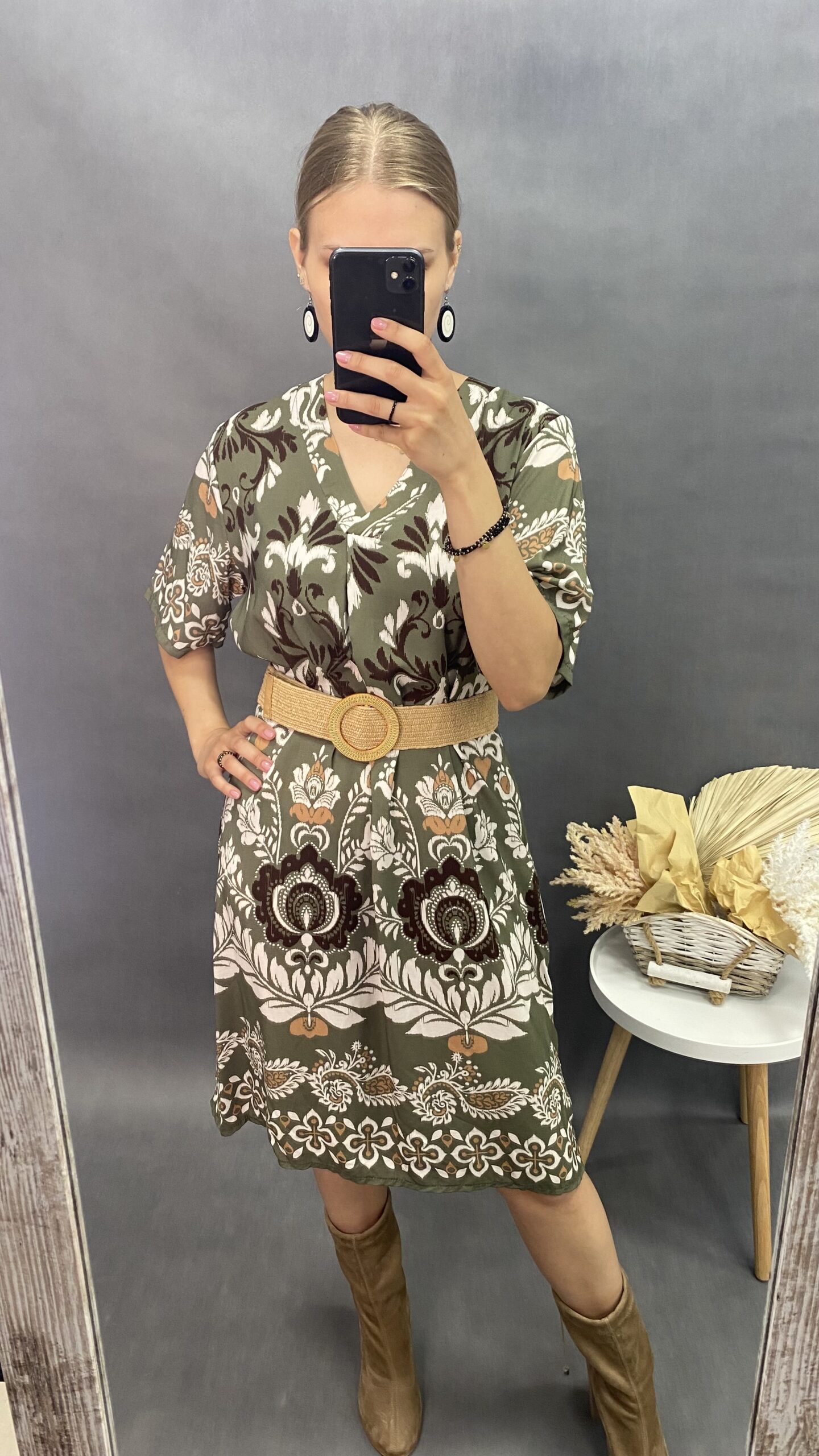 Sukienka midi w ciekawy wzór z krótkim rękawem. Dekolt w serek. Idealna na lato. Włoska produkcja. Jeden rozmiar, pasuje na M-XL.