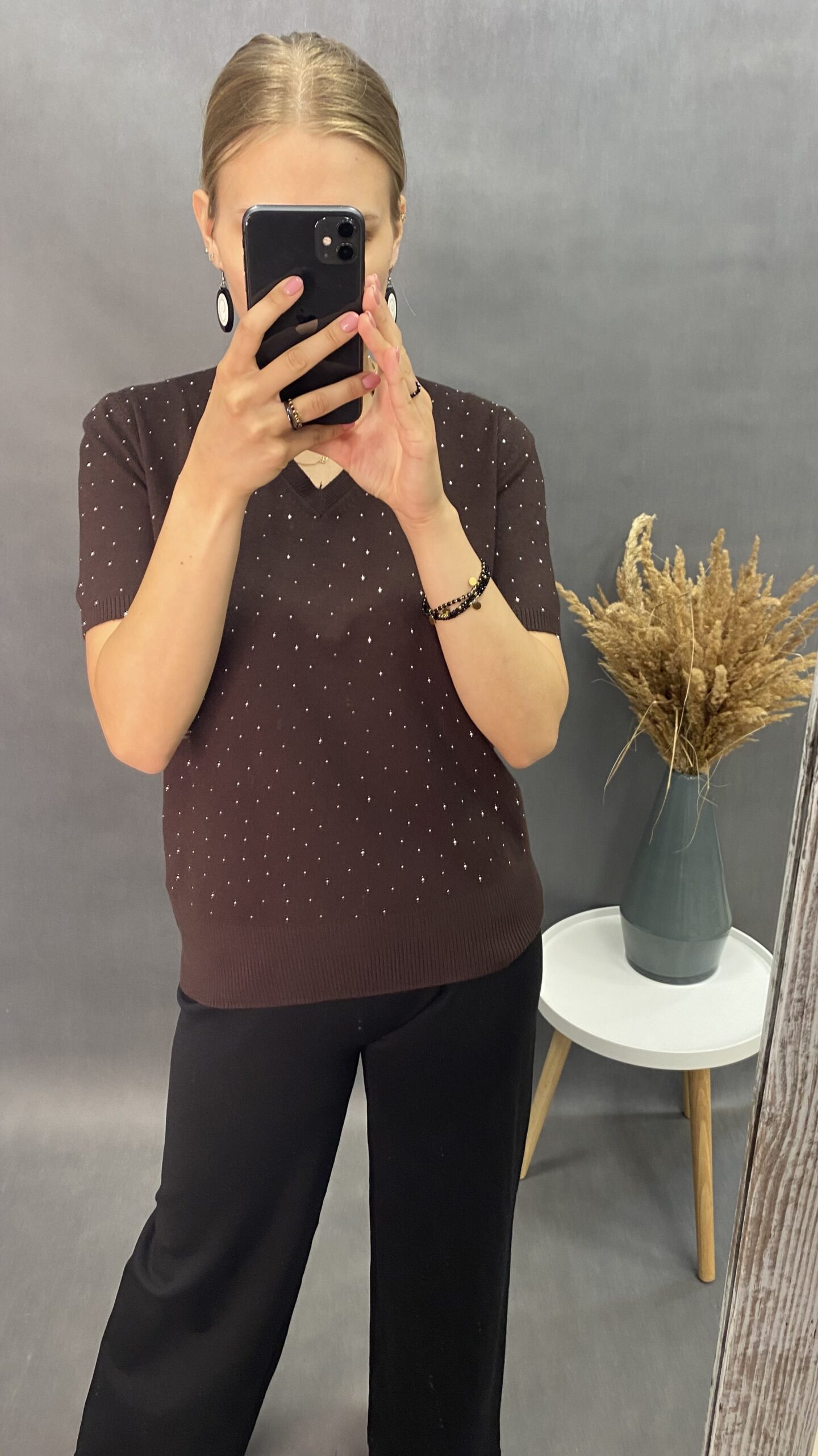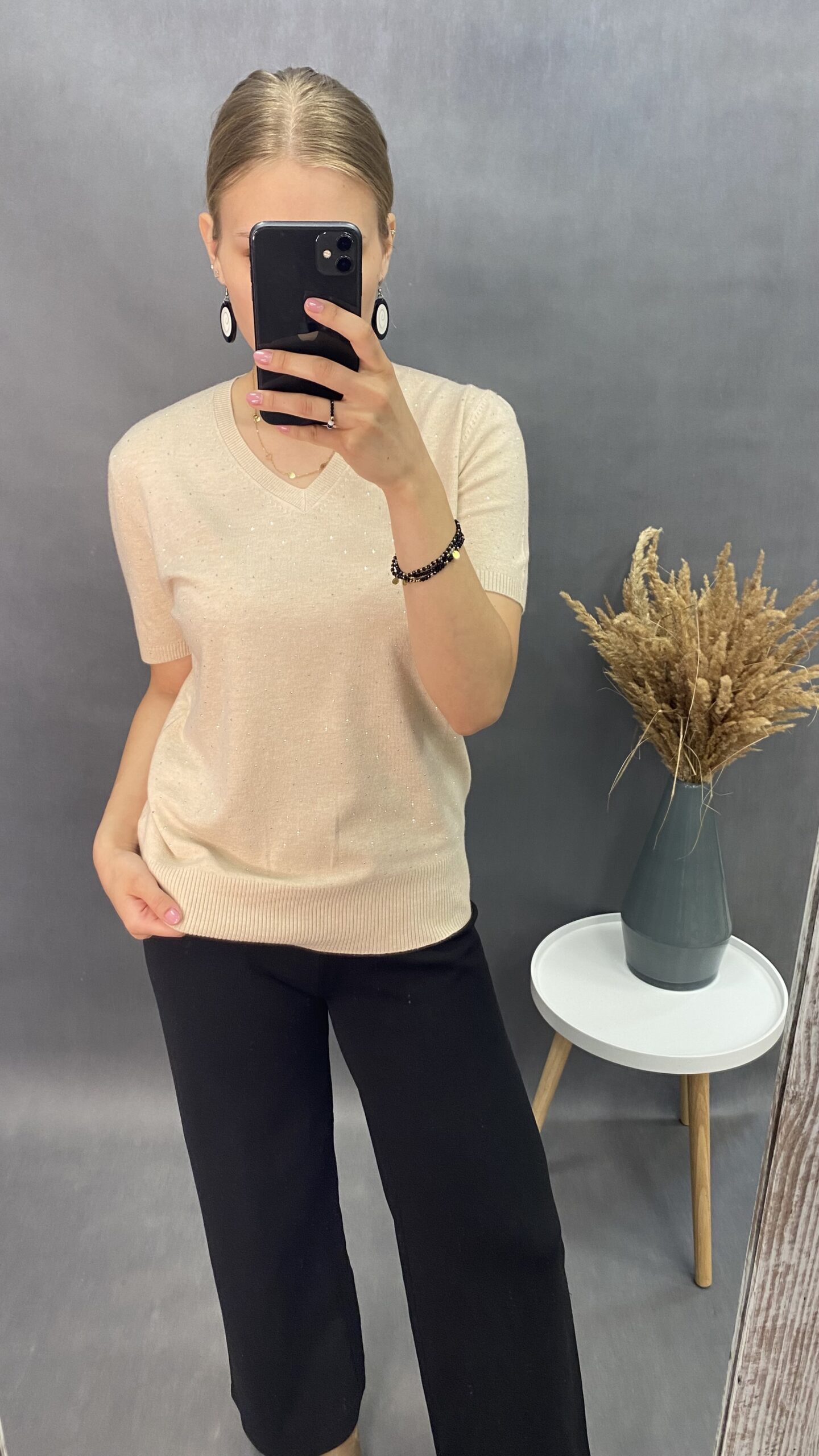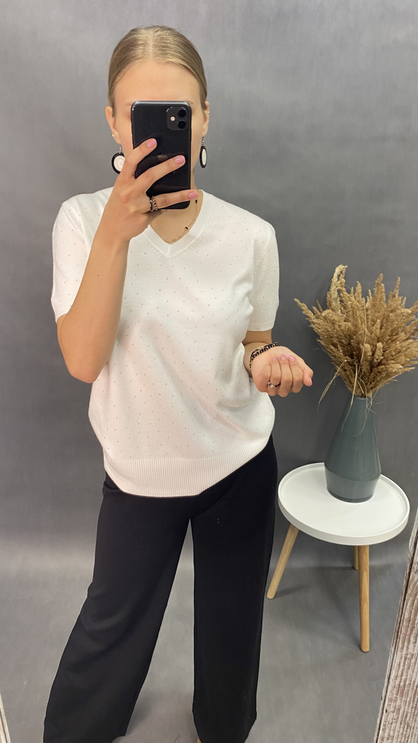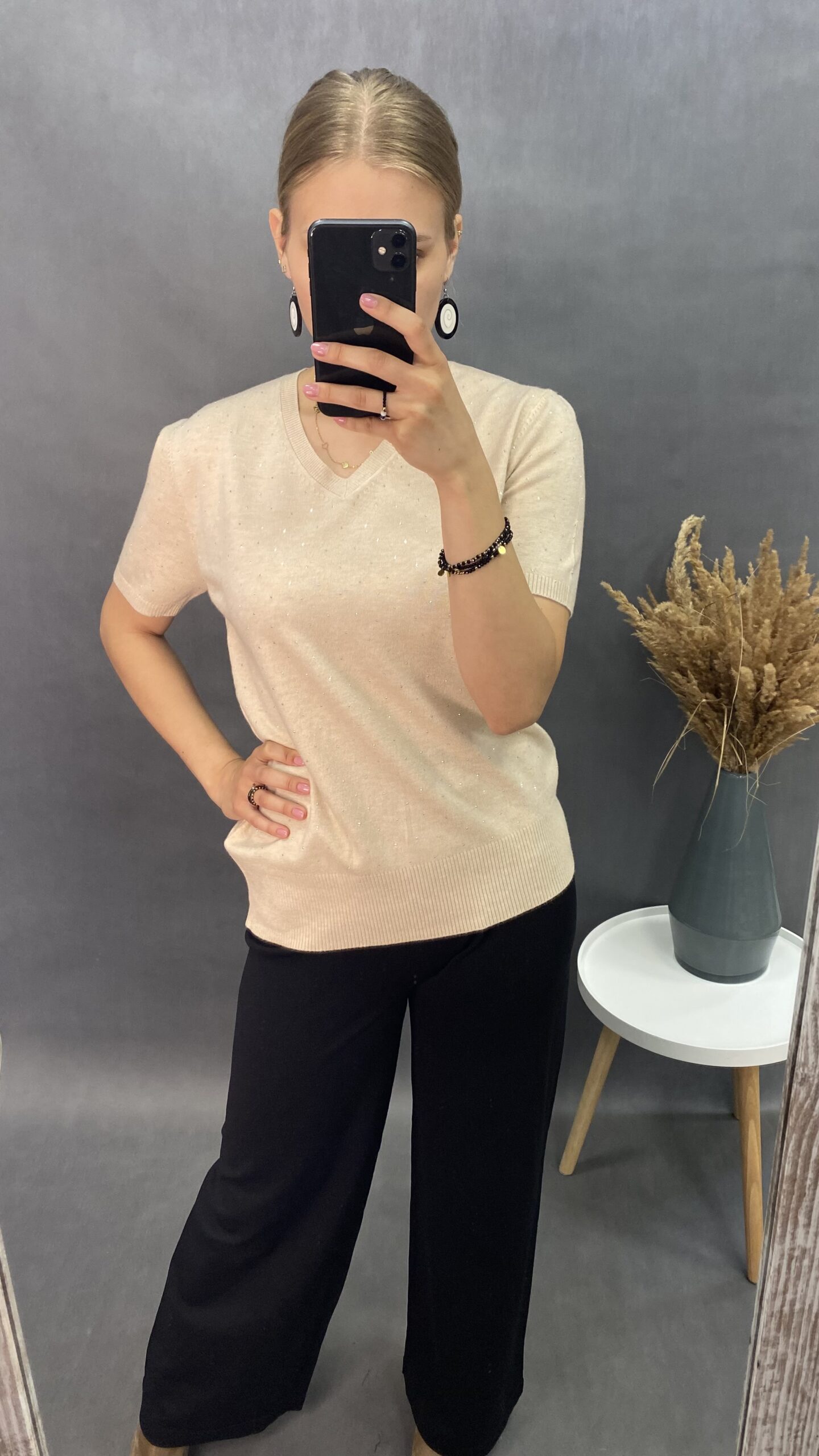 Milutki sweterek z krótkim rękawem i dekoltem w serek z cekinami z przodu. Rozmiar uniwersalny.