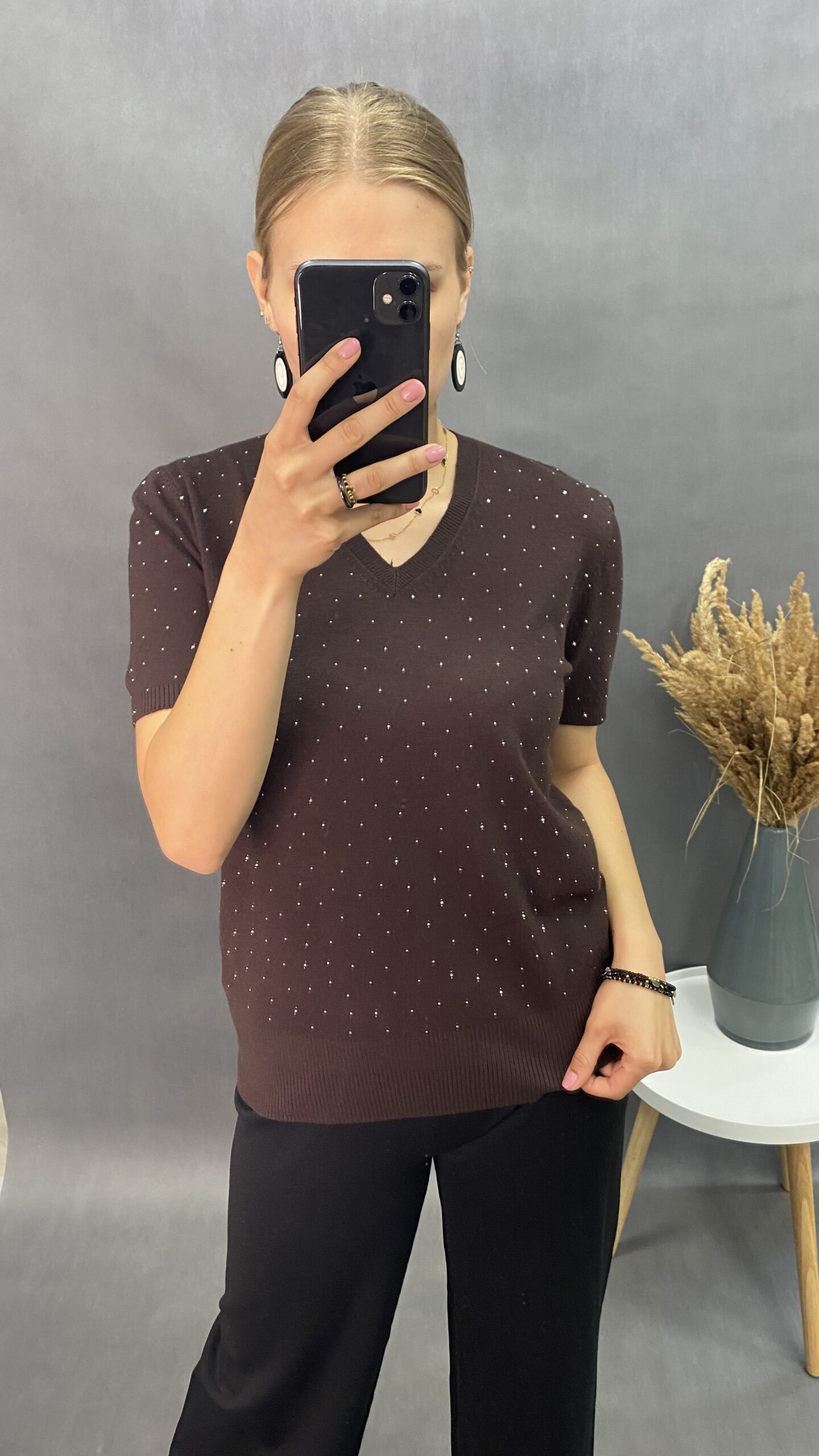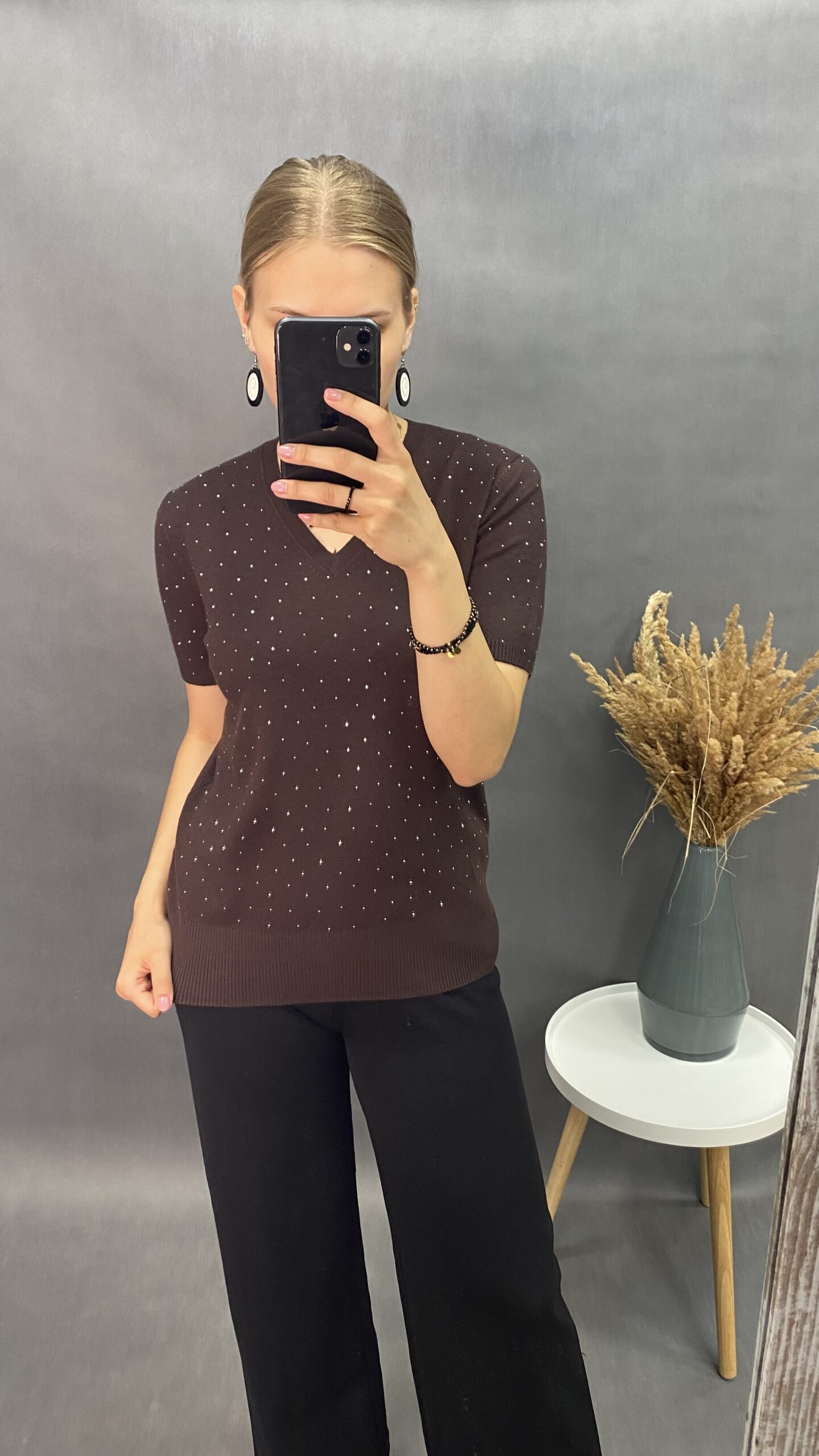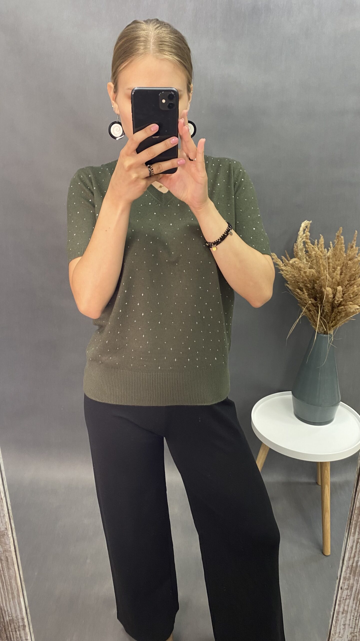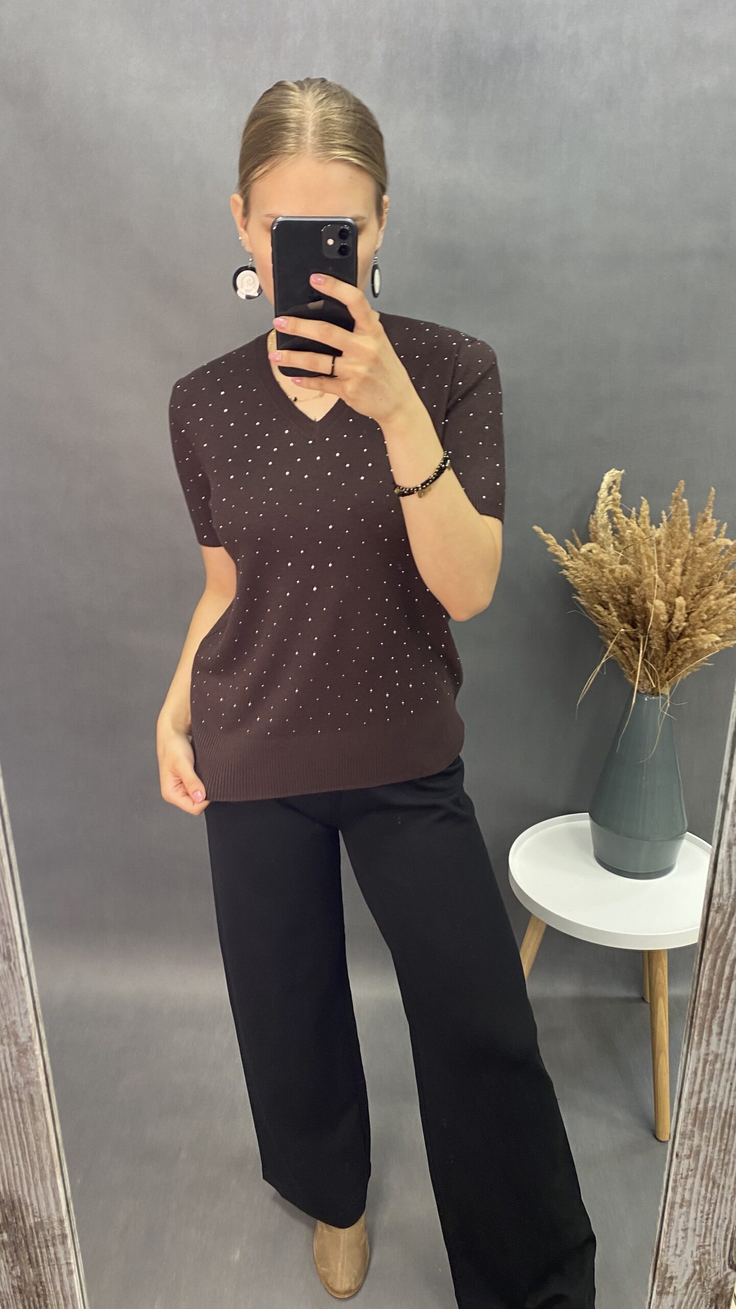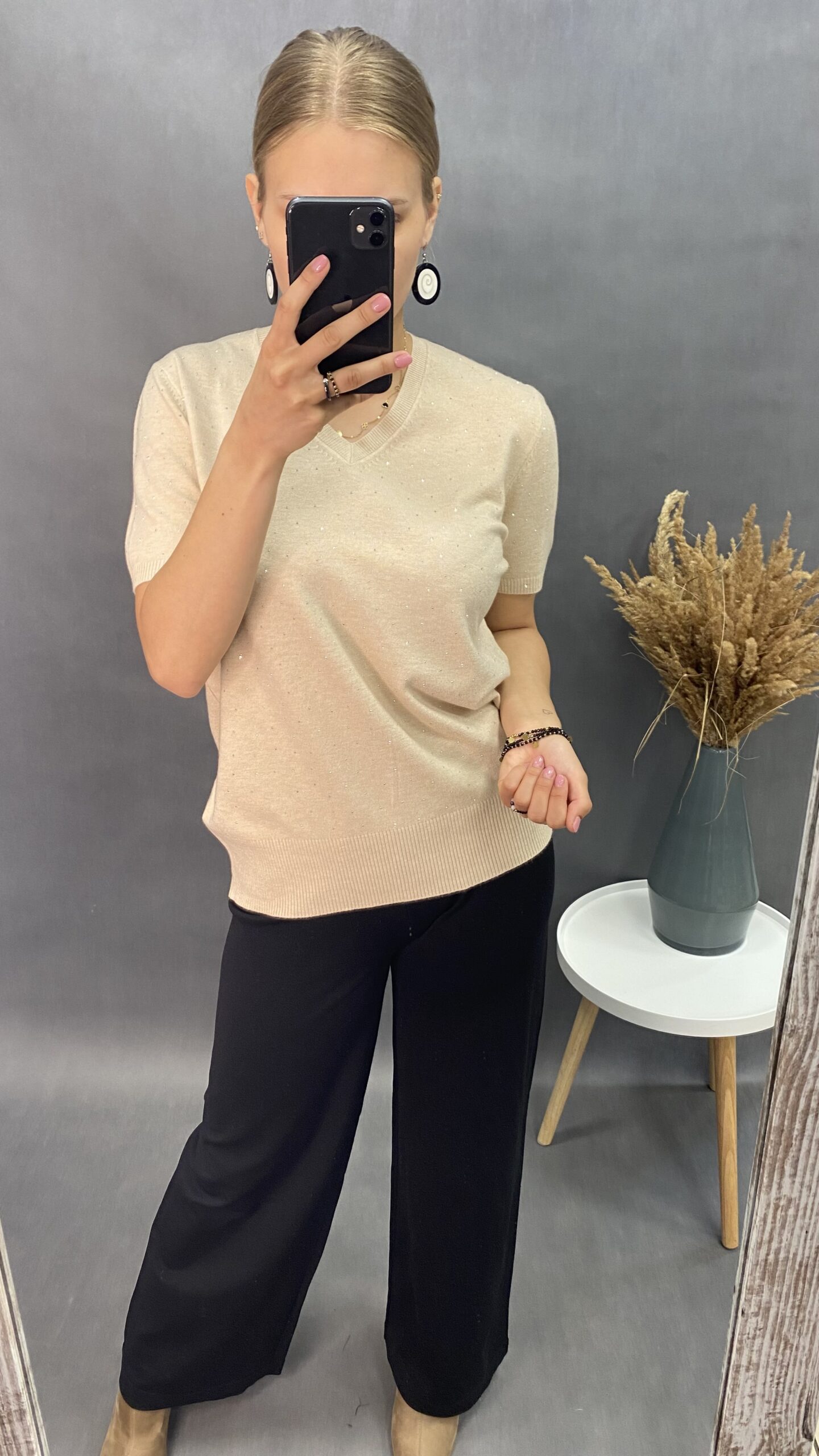 Milutki sweterek z krótkim rękawem i dekoltem w serek z cekinami z przodu. Rozmiar uniwersalny.