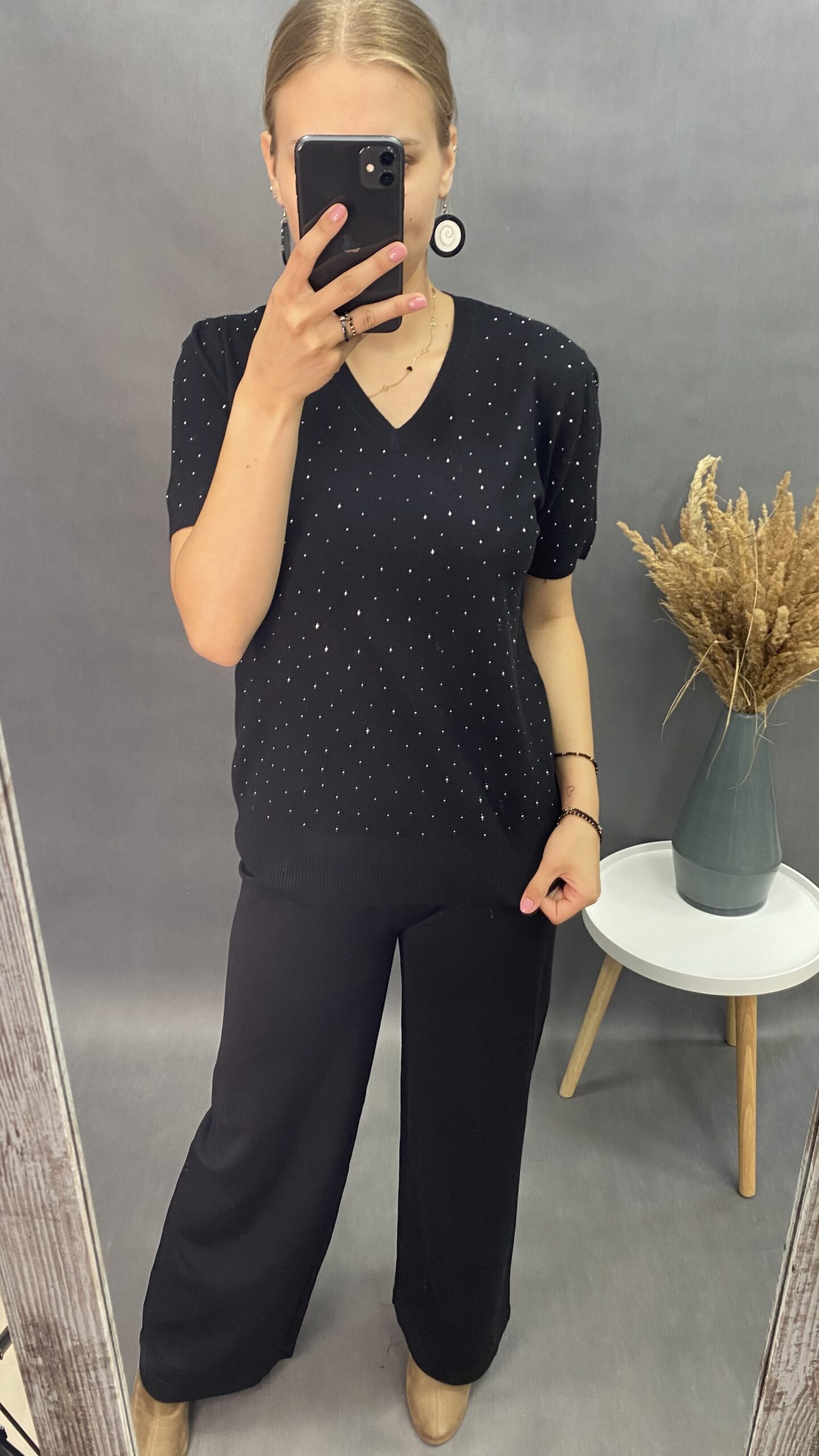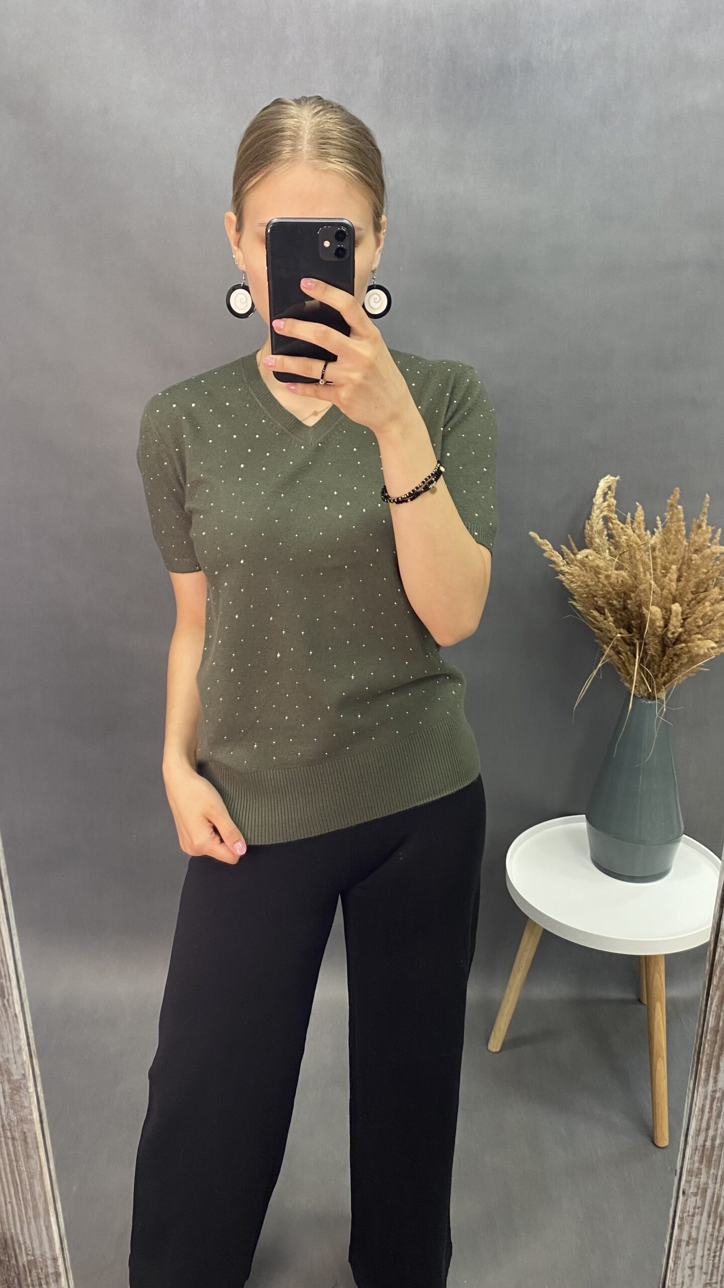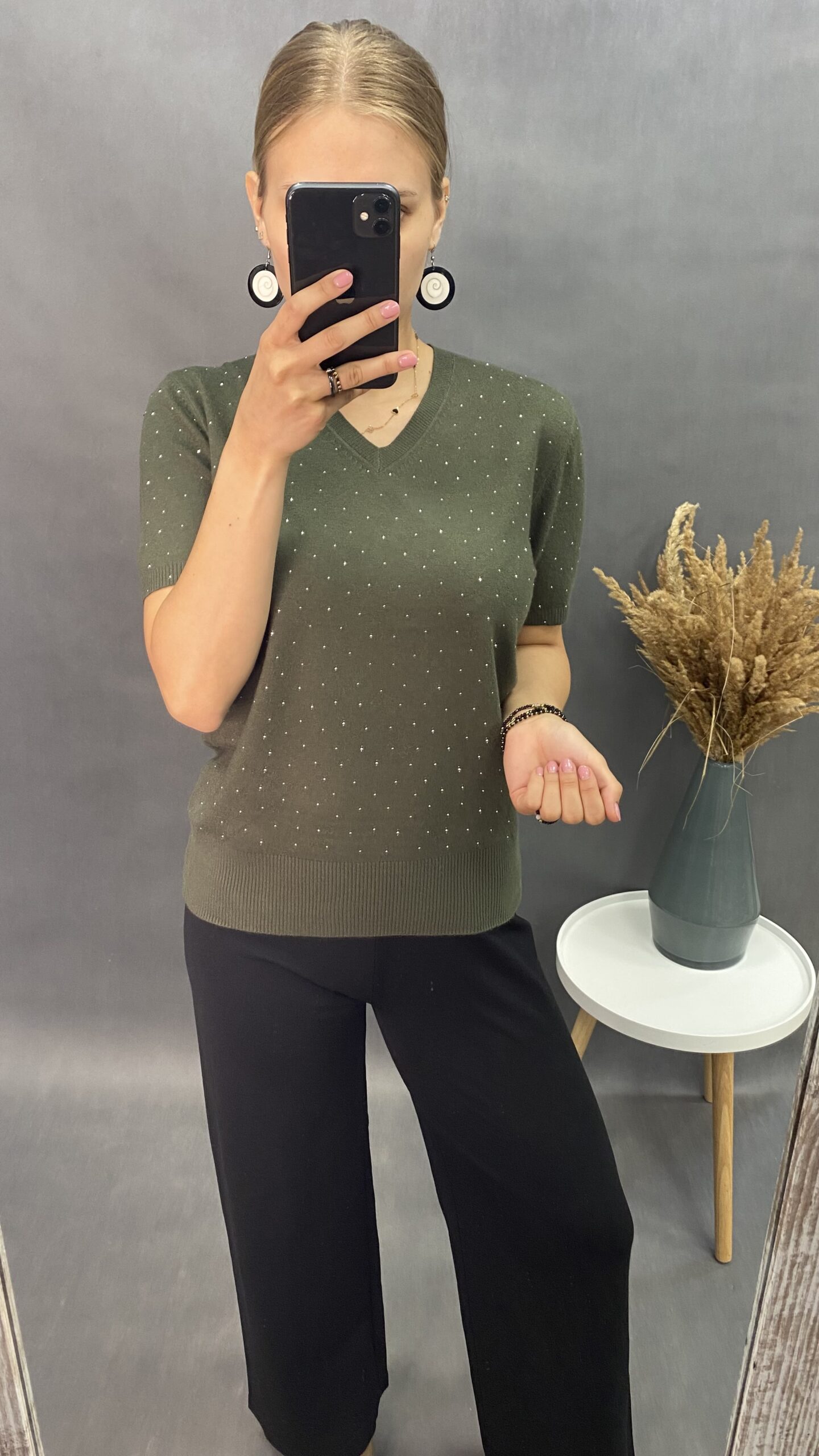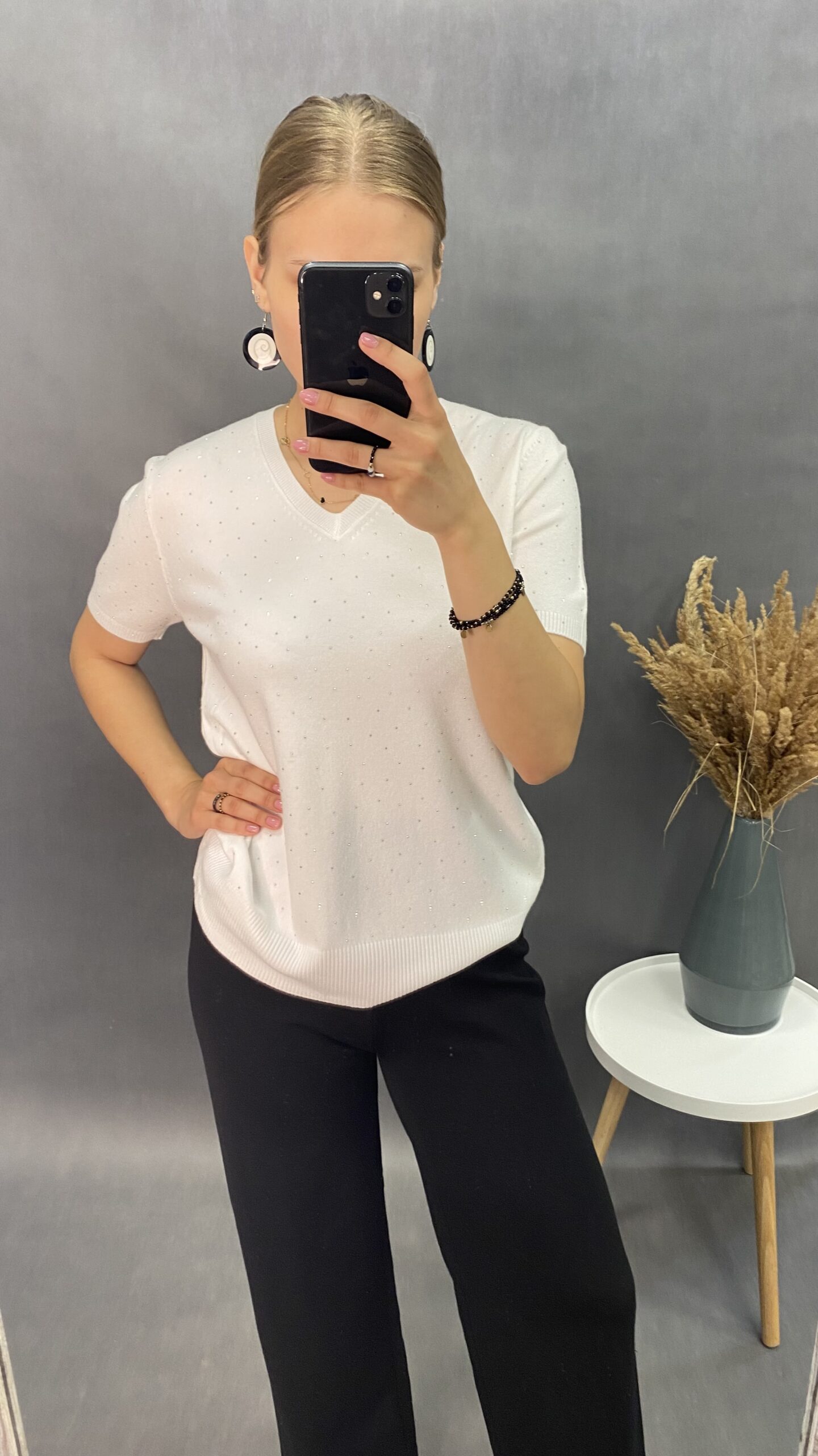 Milutki sweterek z krótkim rękawem i dekoltem w serek z cekinami z przodu. Rozmiar uniwersalny.